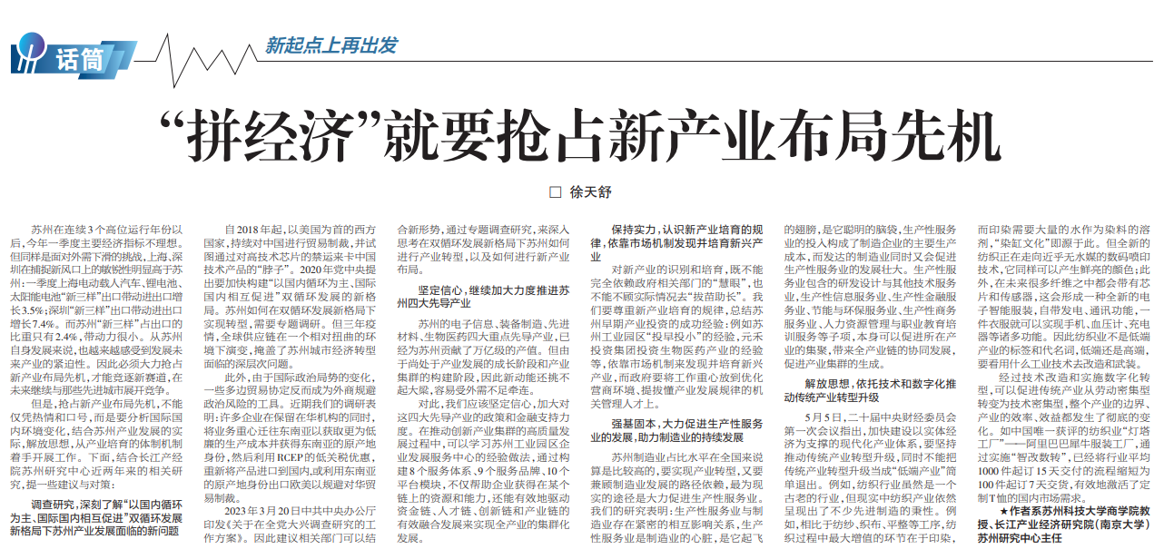 就抢占新产业布局先机,具体应当如何做?苏州日报“思想+”理论月刊进行了专家约稿。公司yd222云顶线路检测徐天舒教授撰写的“‘拼经济’就要抢占新产业布局先机”署名文章于5月30日在苏州日报B01版“思想+”理论月刊刊出。